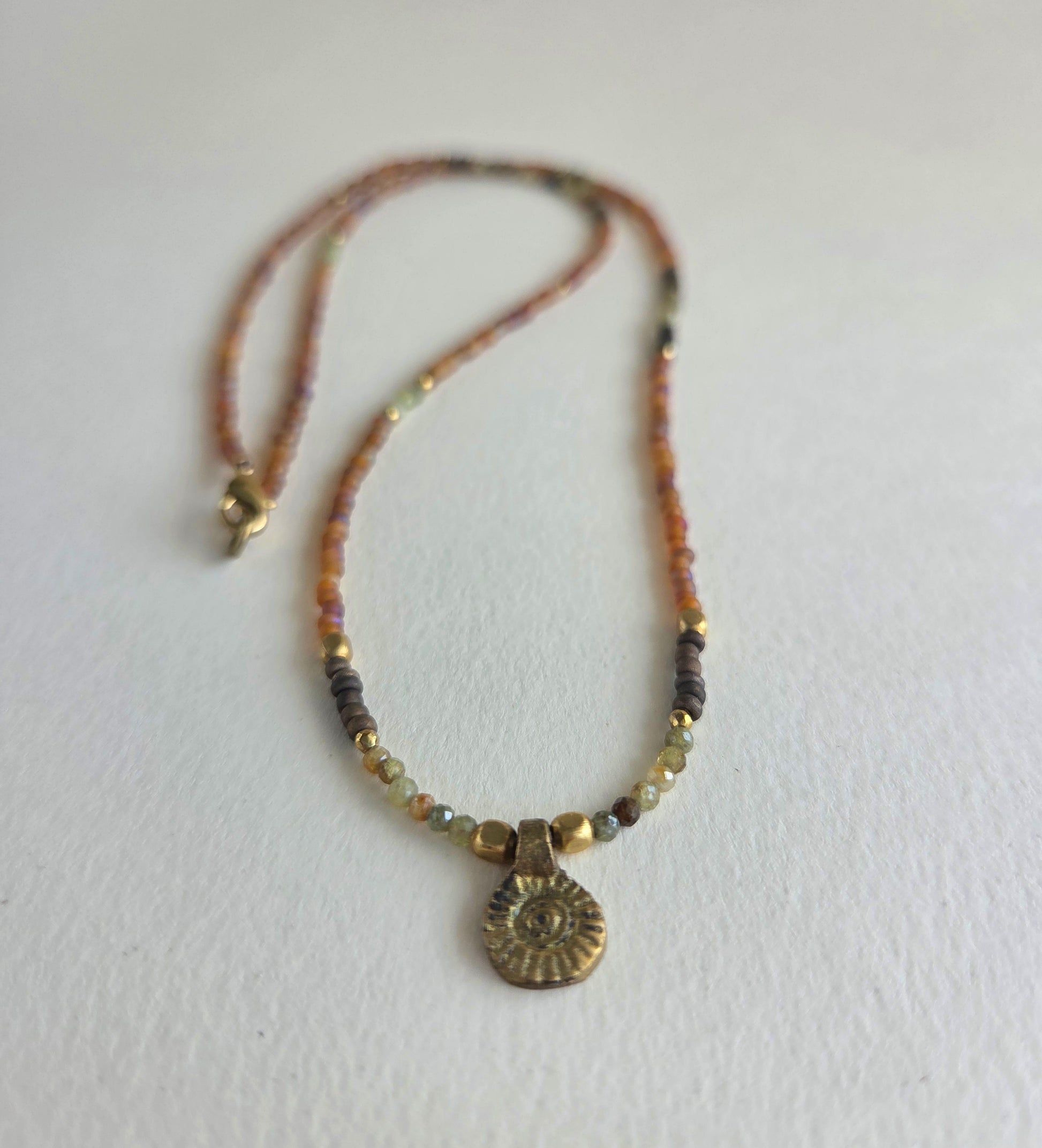 מחרוזת חרוזי זכוכית חומים וסנטר באבני חן