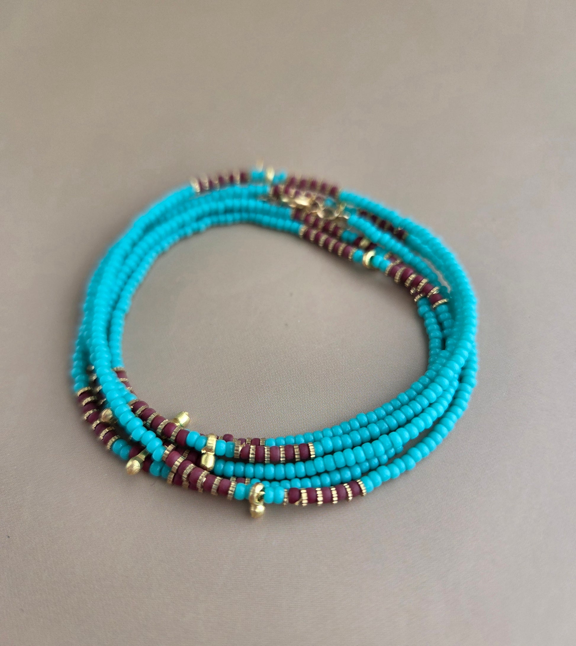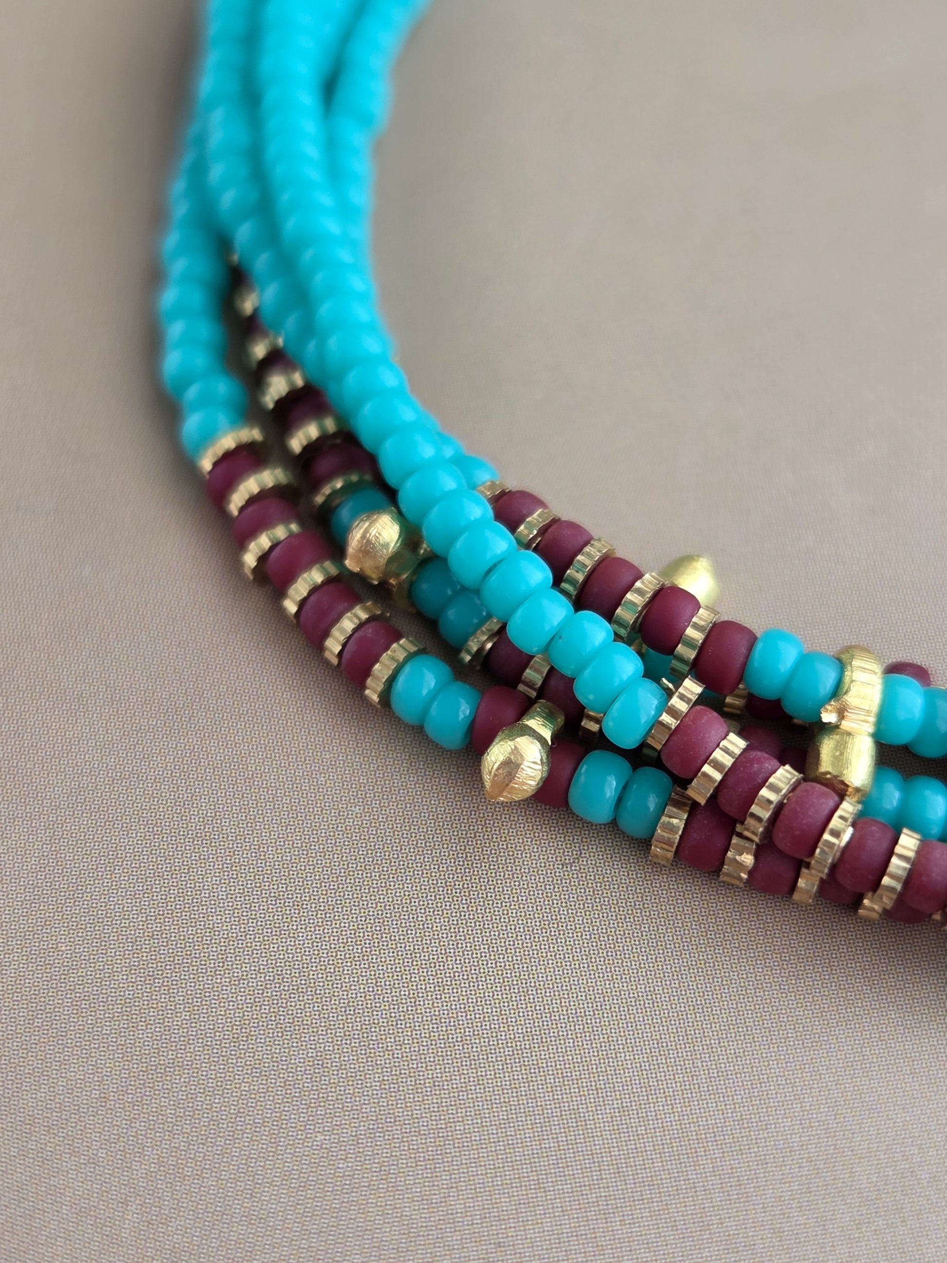 צמיד חרוזים נכרך בתכלת, בורדו ובראס